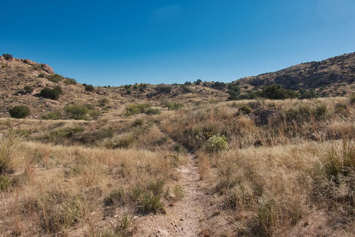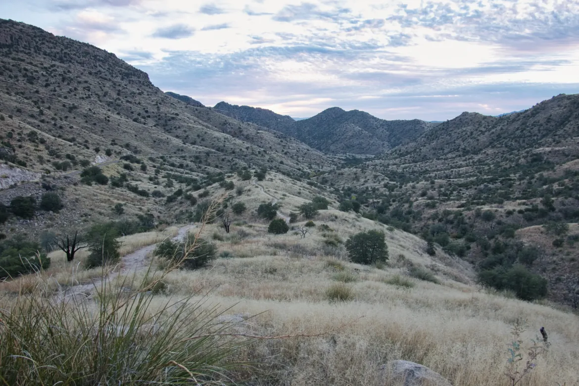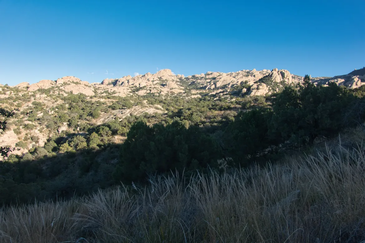 Yesterday’s hiking seems to have gotten beyond the ruggedness of Mt. Lemmon, and the trail was much more gentle today. It started on rolling hills walking down a valley before crossing a road and climbing to a minor pass.
