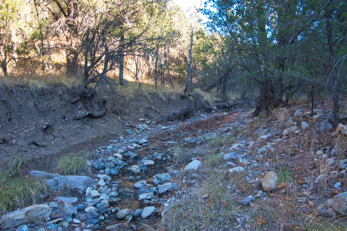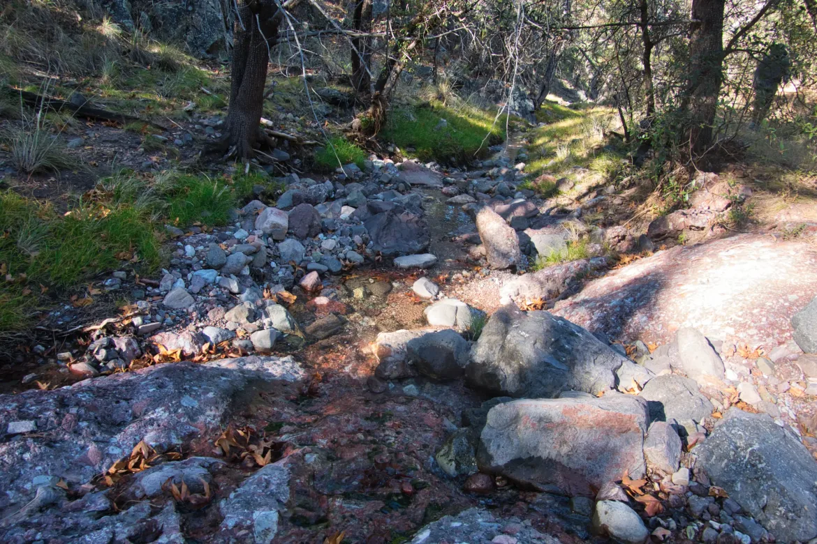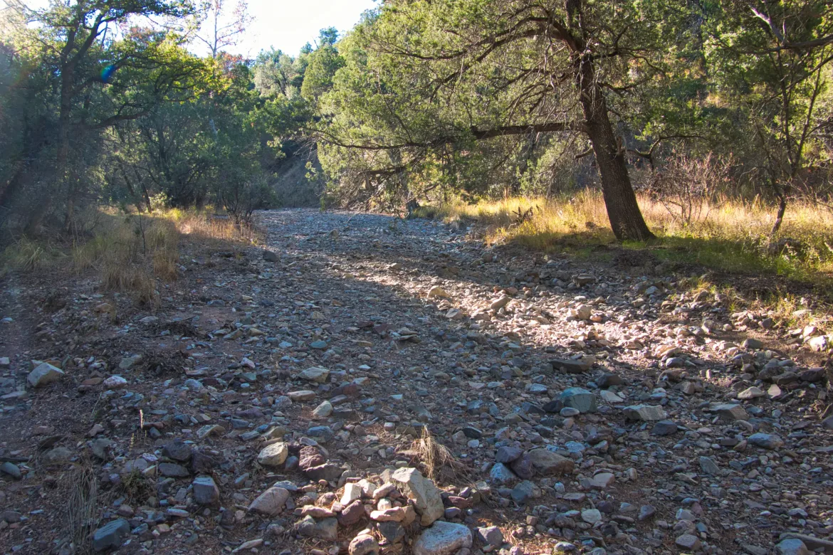 We crisscrossed the stream as we worked our way up it. We were on the start of a climb up into our final mountain range, the Huachuca Mountains. The creek ascent was very gradual for a while and pretty easy. We strolled across grassy fields and through forests. As the trail rose more, the surrounds changed to all forest with good size trees for this area. It was a nice walk up, and different than the surrounding desert we have been passing through.
