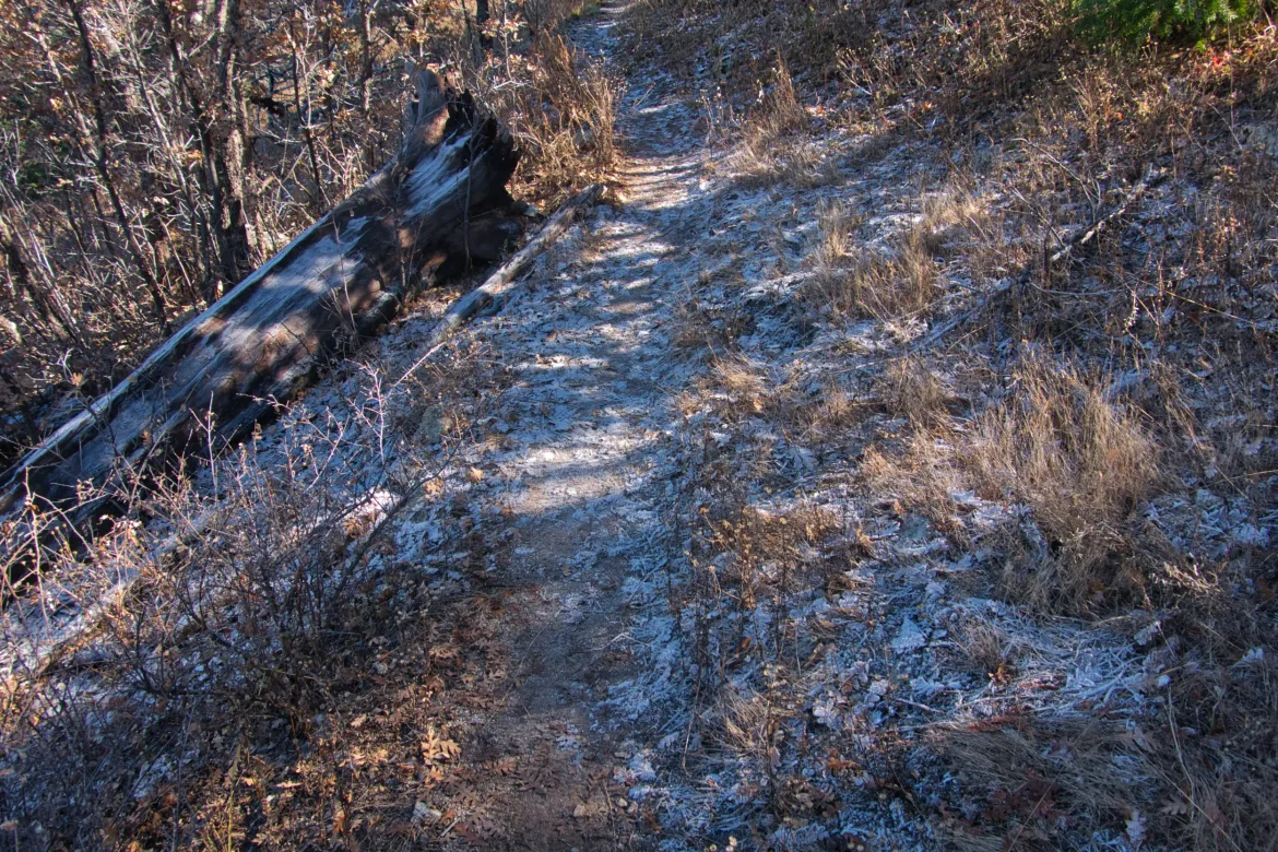 Almost as soon as we crossed the stream we were camped by, the temperature warmed significantly. We were definitely in a very localized cold spot. Oh well, we made it through the night.